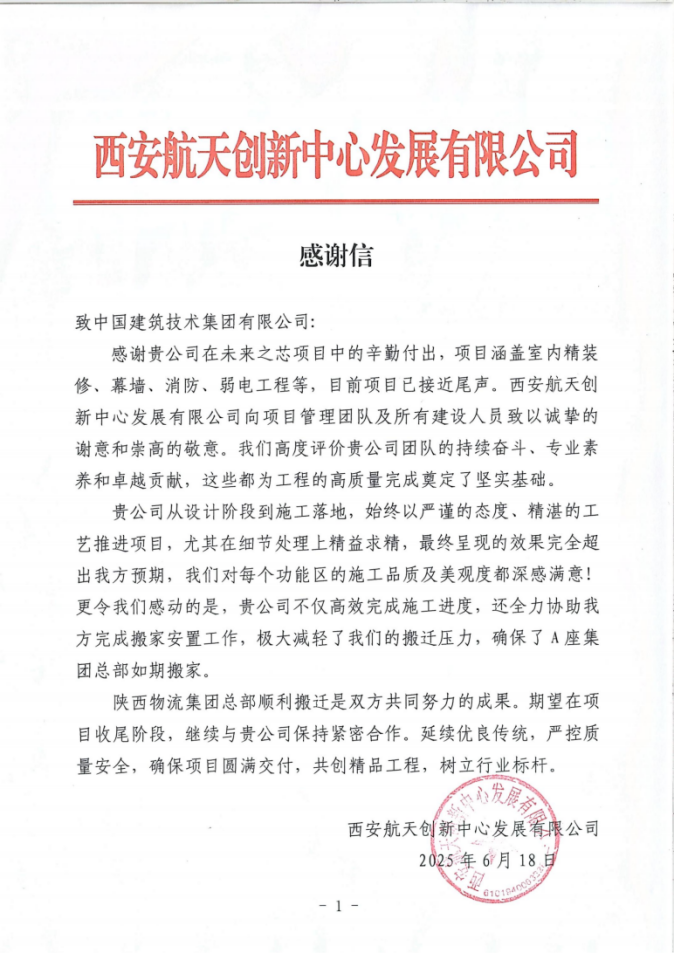 近期,凯发K8国际建设收到西安航天创新中心开展有限公司(以下简称“西安航发”)发来的感谢信。对凯发K8国际建设在西安“未来之芯”项目团队展现出的专业素养、高效协作以及卓越的项目管理能力给予高度赞扬。